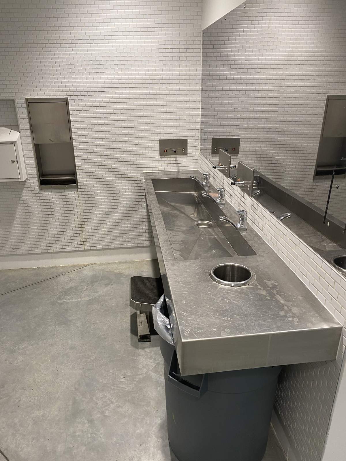 Hands-free elements are used to reduce germs and a stainless-steel trough-style sink prevents water from splashing on the floor.