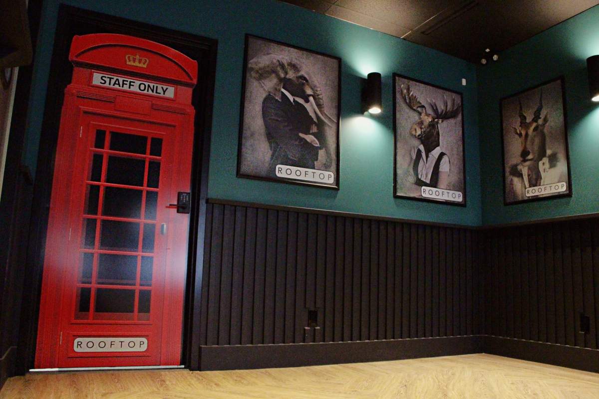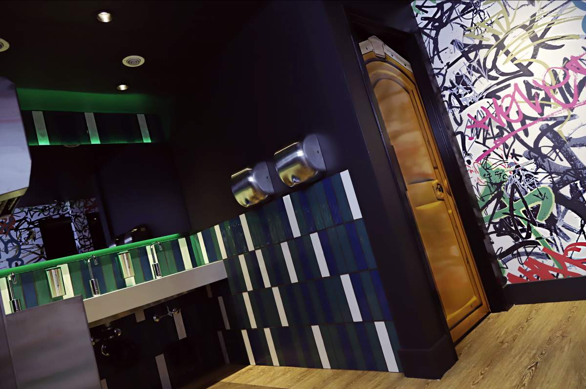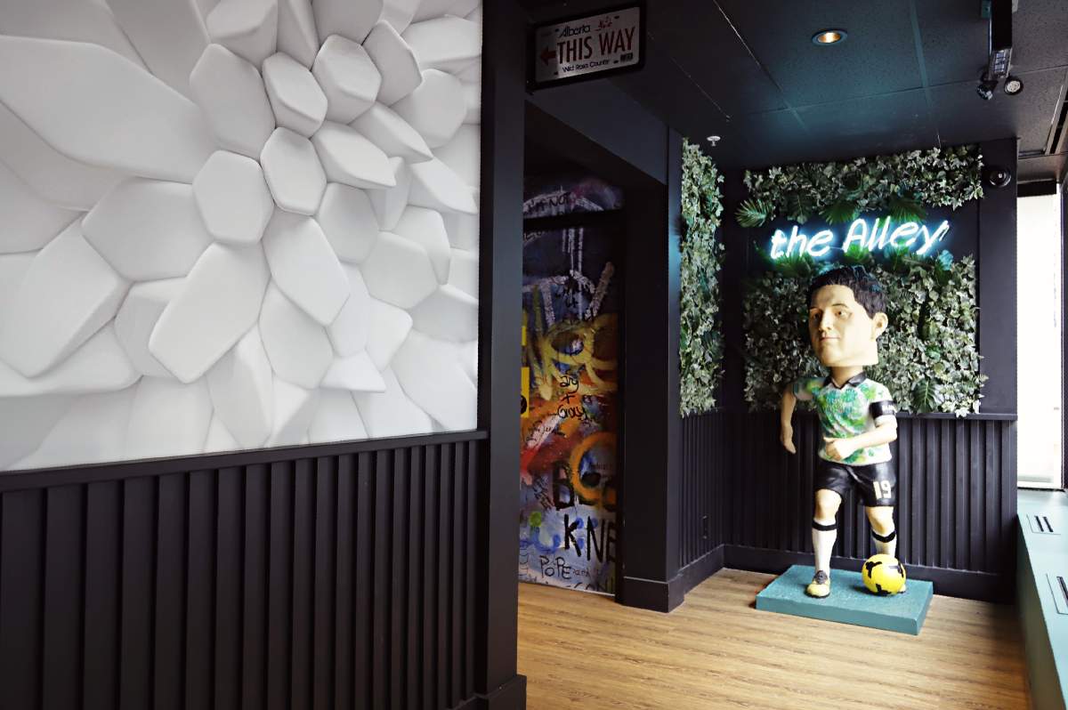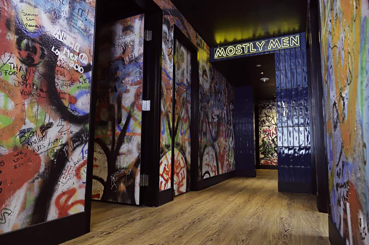 A life-sized bobblehead greets patrons as they enter “the alley.” Graffiti wallpaper with sections taken largely from the “John Lennon Peace Wall,” originally created in Prague, line the walls of the washrooms.
