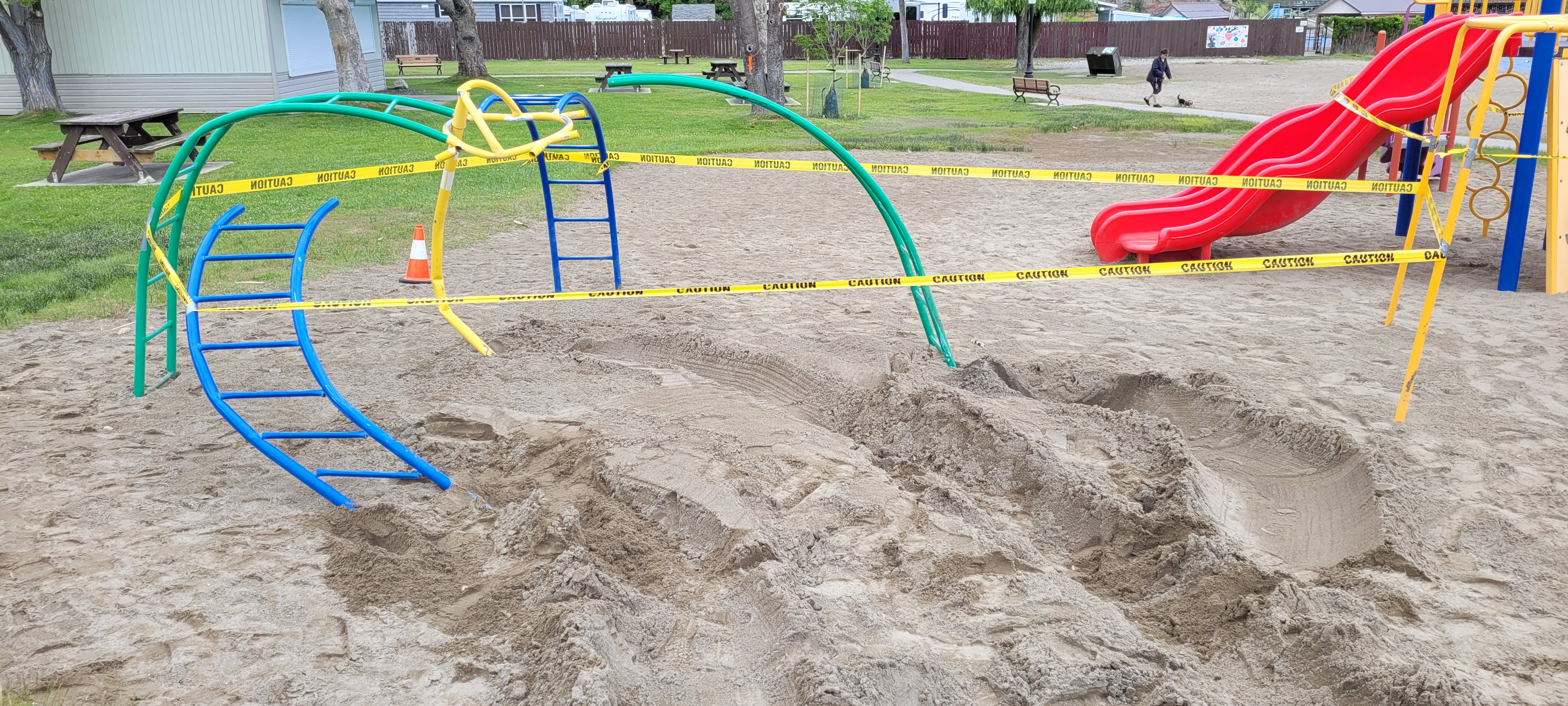 “Witnesses were also spoken with but no one could identify who was driving the SUV at the time the playground was damaged,” said Penticton RCMP.