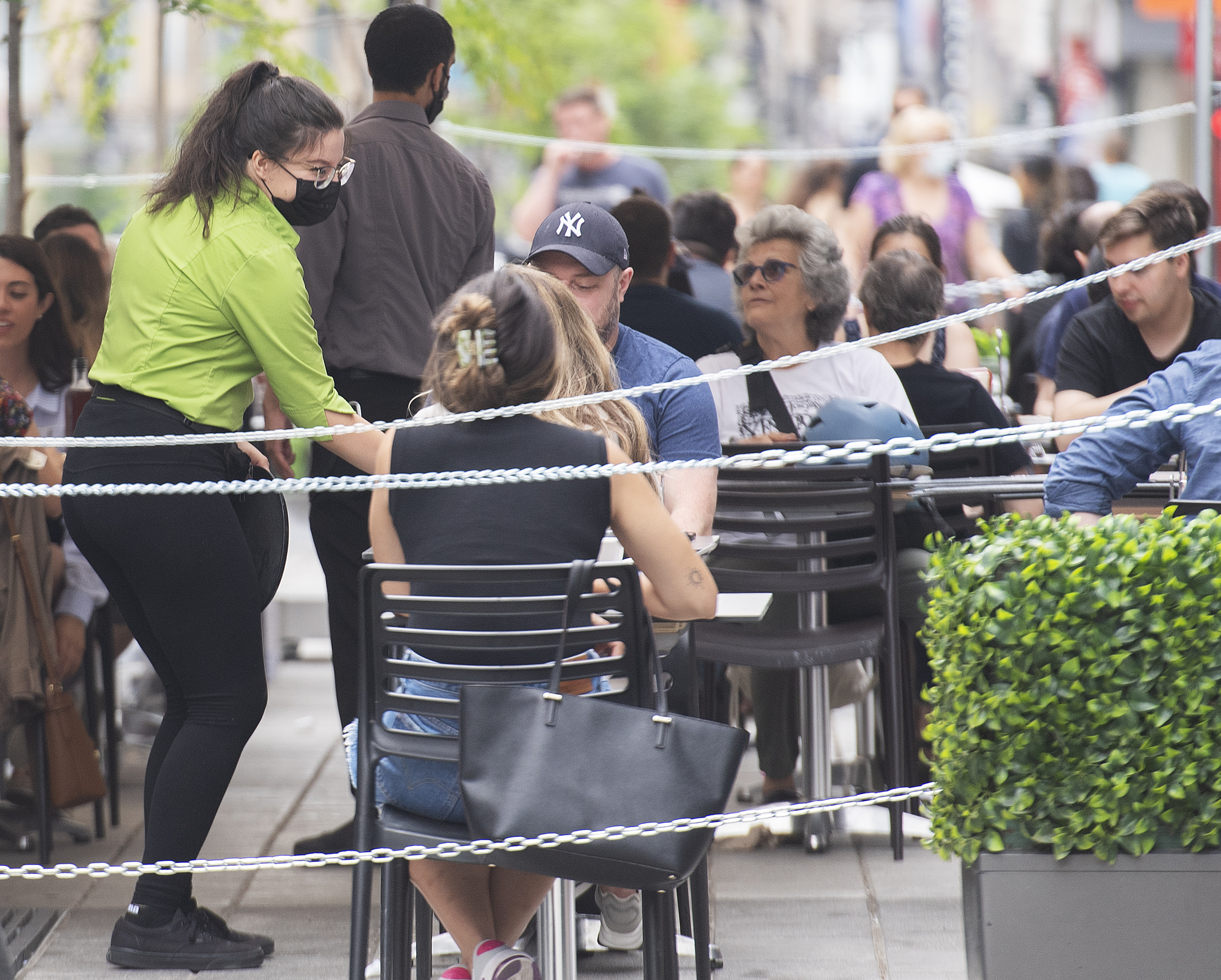 Patrons can sit outside on patios (terrasses) but they must be a maximum of two people from two households. One household may also sit together.