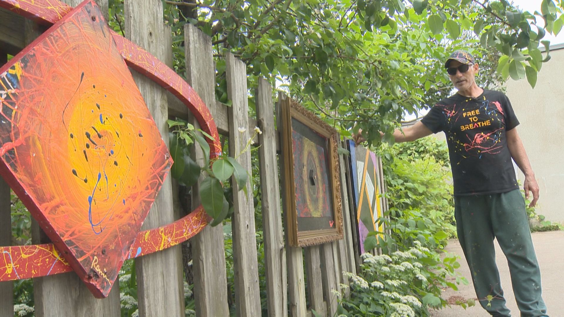 McQueen has several colourful canvases zip-tied on his backyard fence. He even has some of the art inside his home. He encourages the use of space and says it brings life to the community alleyway.