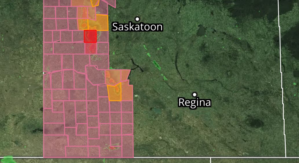 At 5:52 p.m. CST, meteorologists said they were tracking a severe thunderstorm that is producing a tornado. This thunderstorm is 14 km north of D’Arcy, Sask. and is travelling northeast at 20 km/h.