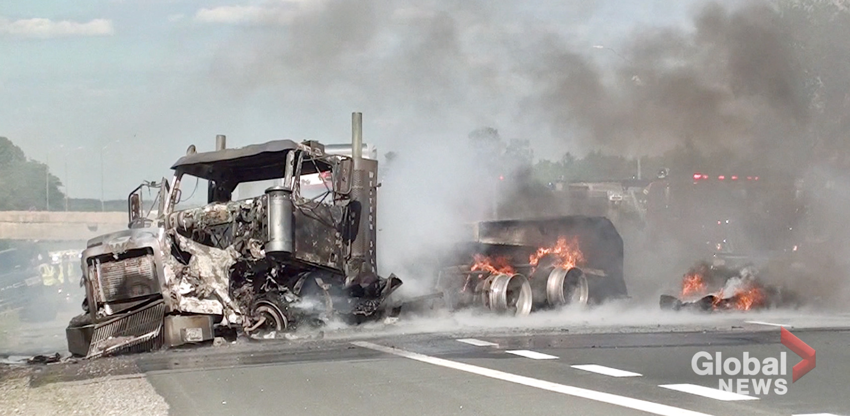 Northumberland OPP determined the transport truck had a front tire blow out. That caused the driver to lose control of the vehicle, which struck the median wall before igniting on fire.