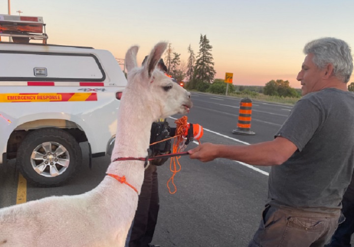 Ontario Provincial Police have reunited a white llama found wandering on Highway 400 near King City Wednesday evening with its owner.