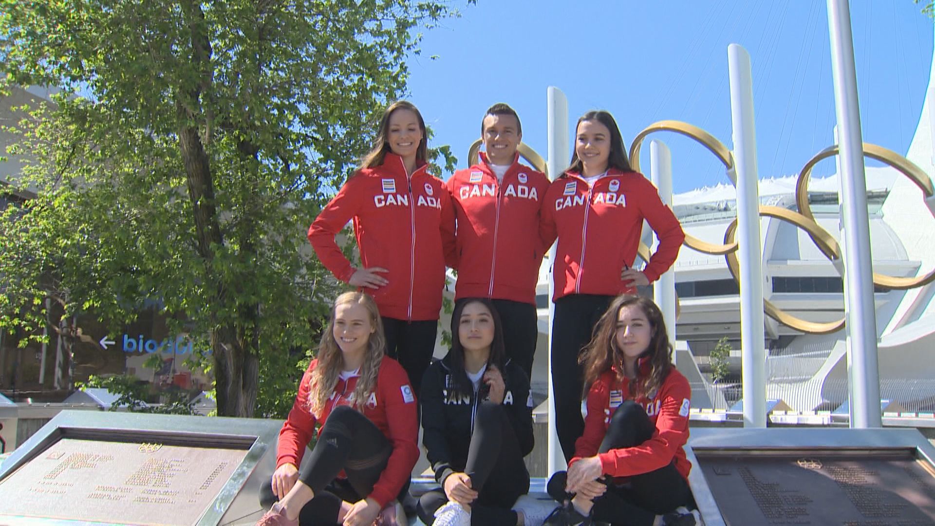 Members of the artistic gymnastics team received their red and white Canada jerseys Thursday on the grounds of the Montreal Olympic stadium.