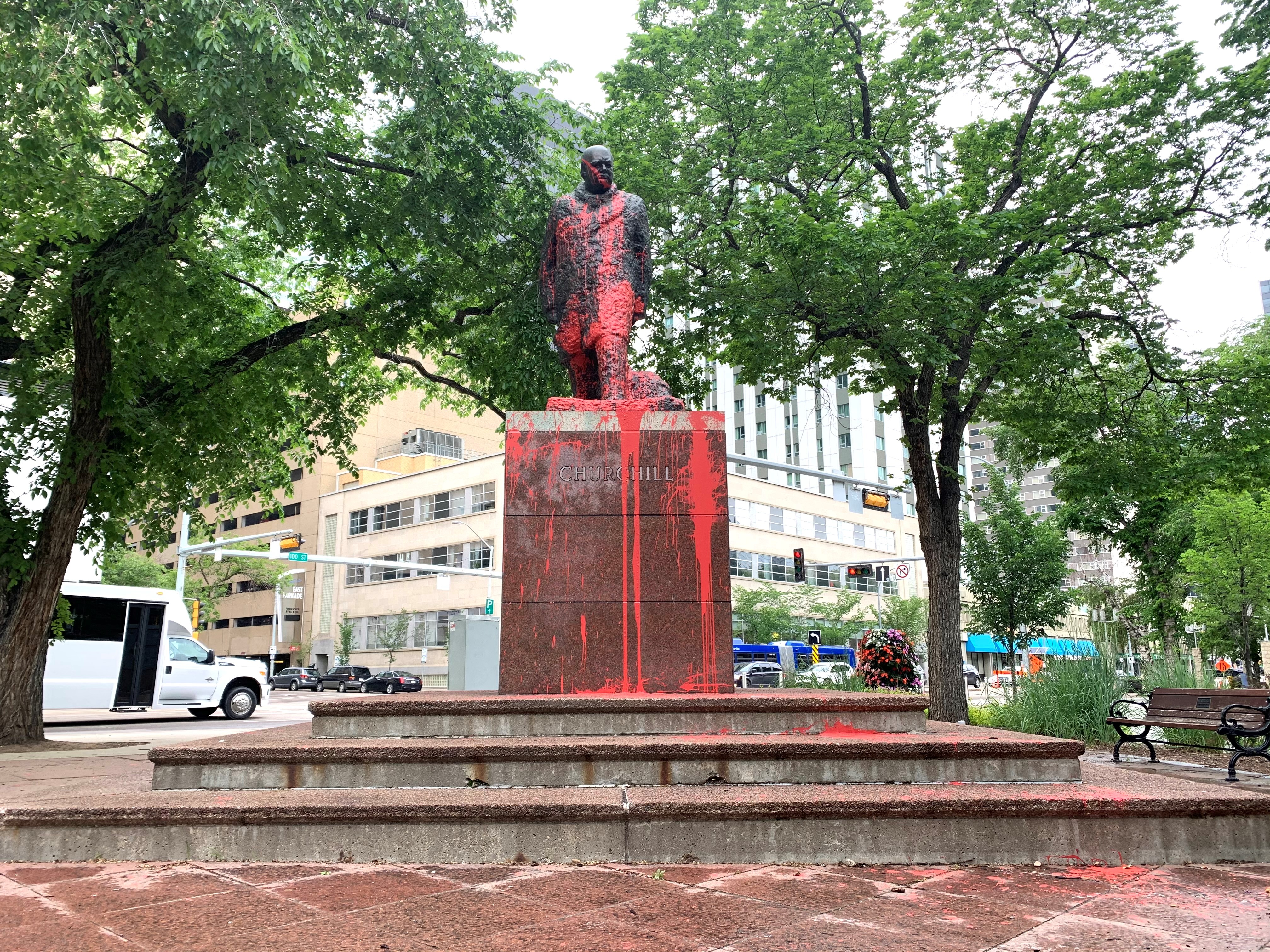 The statue of Sir Winston Churchill in downtown Edmonton has been vandalized with red paint.