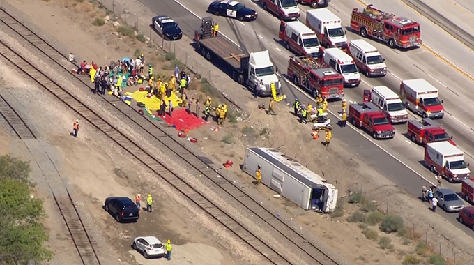Video: Aerials from scene of overturned bus in California