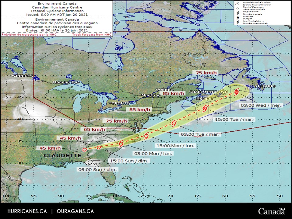 The track forecast shows Claudette with winds of 85 km/h as it moves south of Nova Scotia at 3 p.m. on Tuesday.
