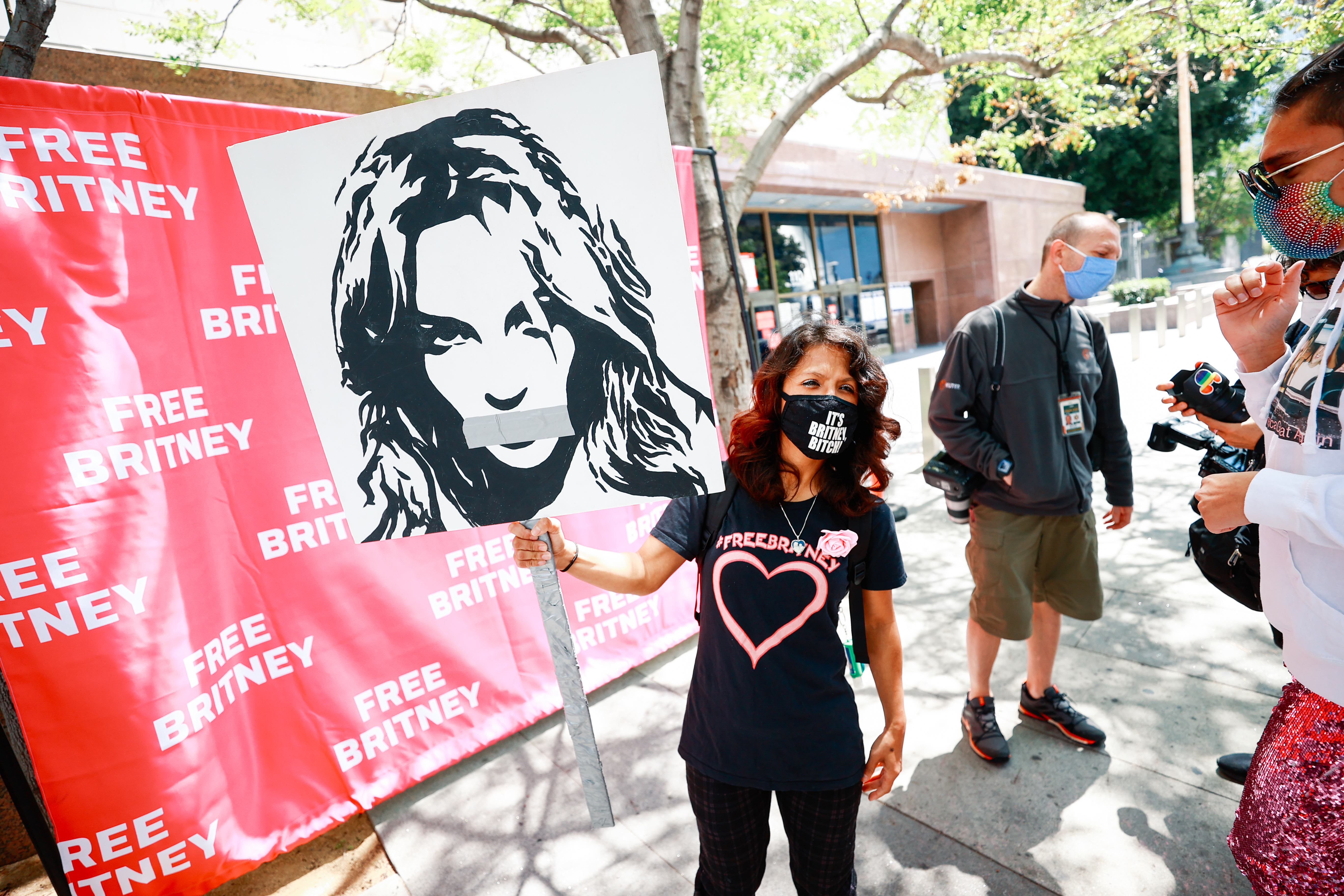 More than 100 fans from the so-called #FreeBritney movement gathered outside the courthouse before the hearing, holding signs that read “Free Britney now!” and “Get out of Britney’s life!”