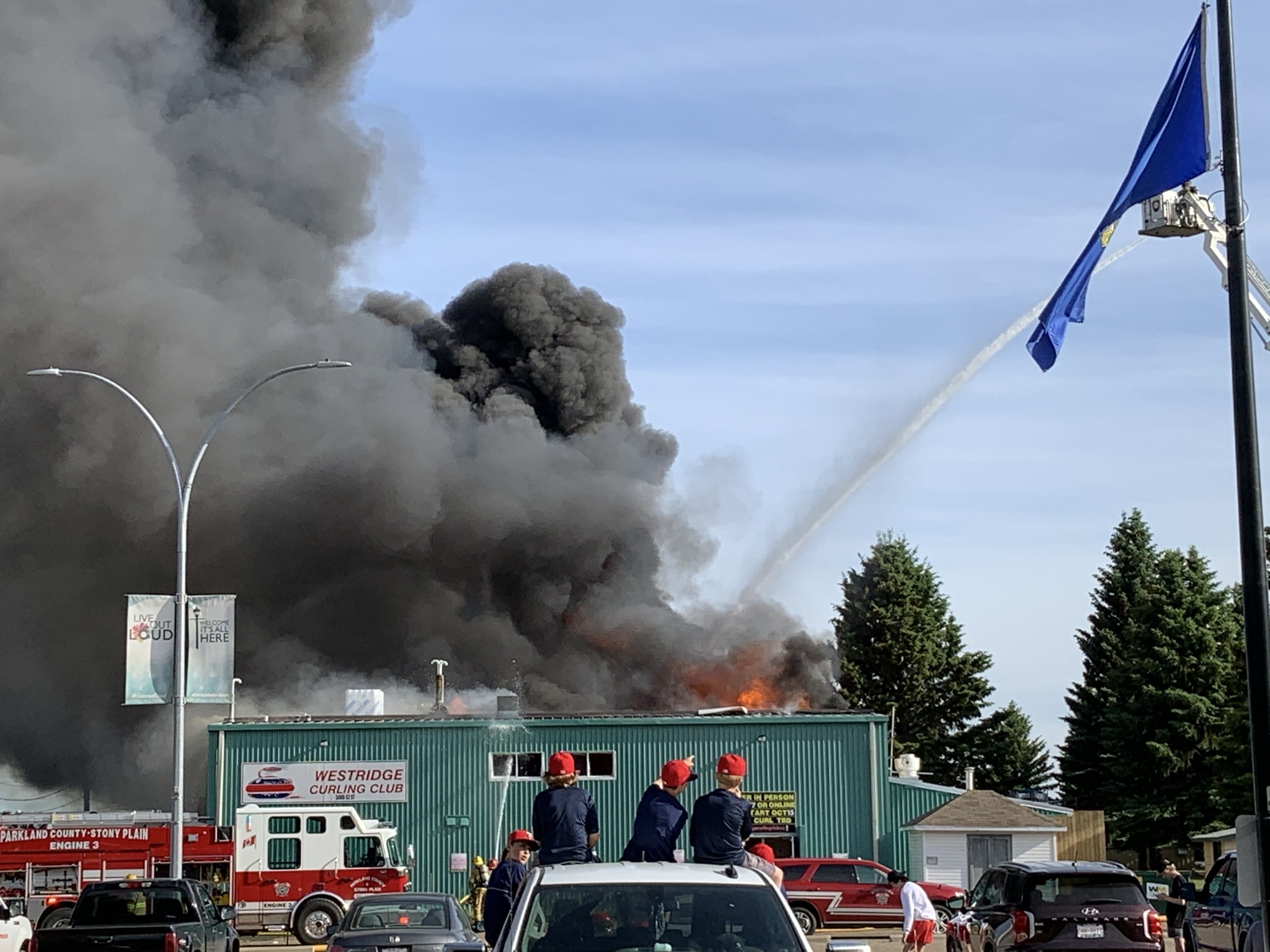 Thick, black smoke filled the sky over Stony Plain on Wednesday night, where the local curling rink went up in flames.