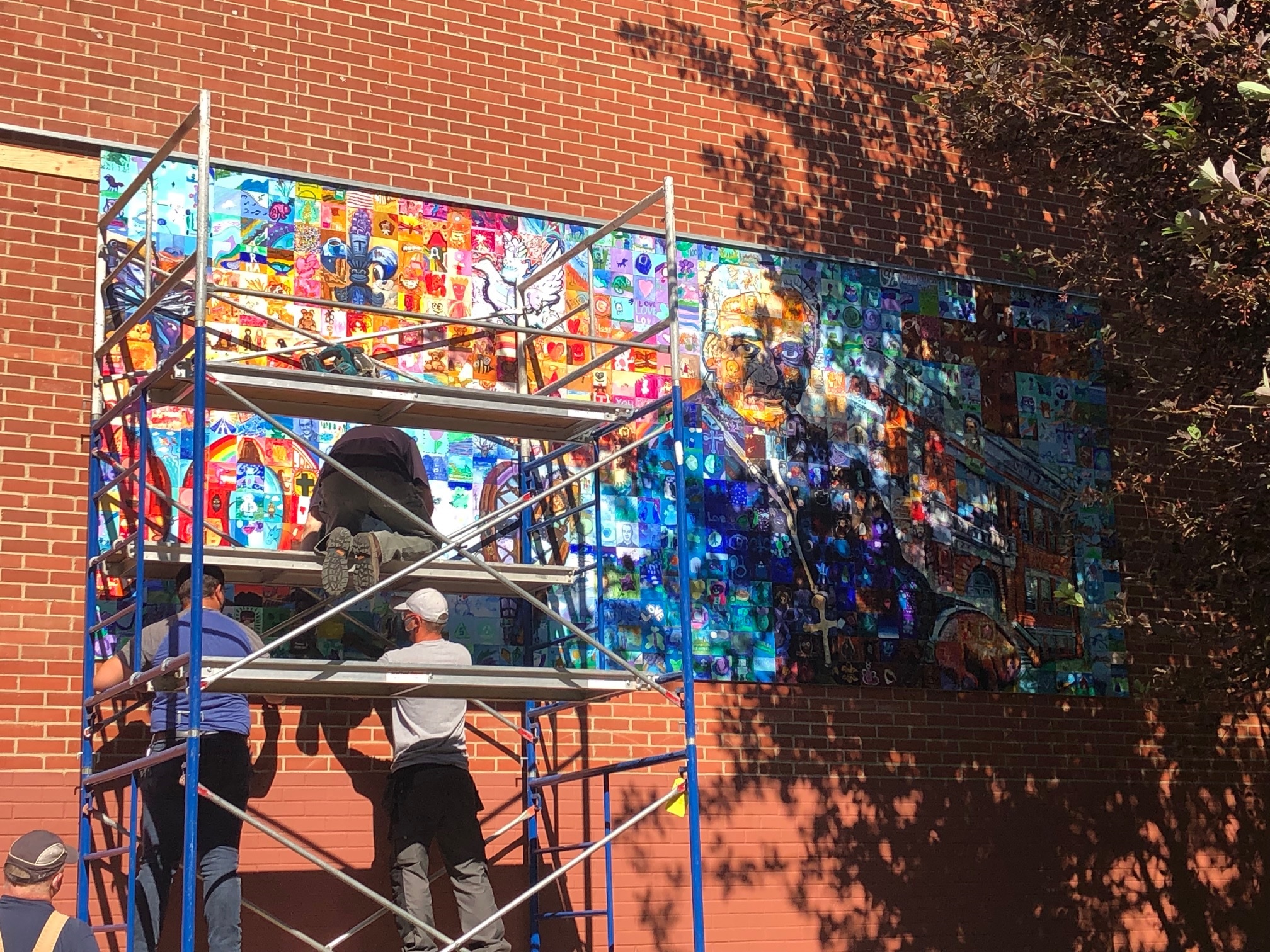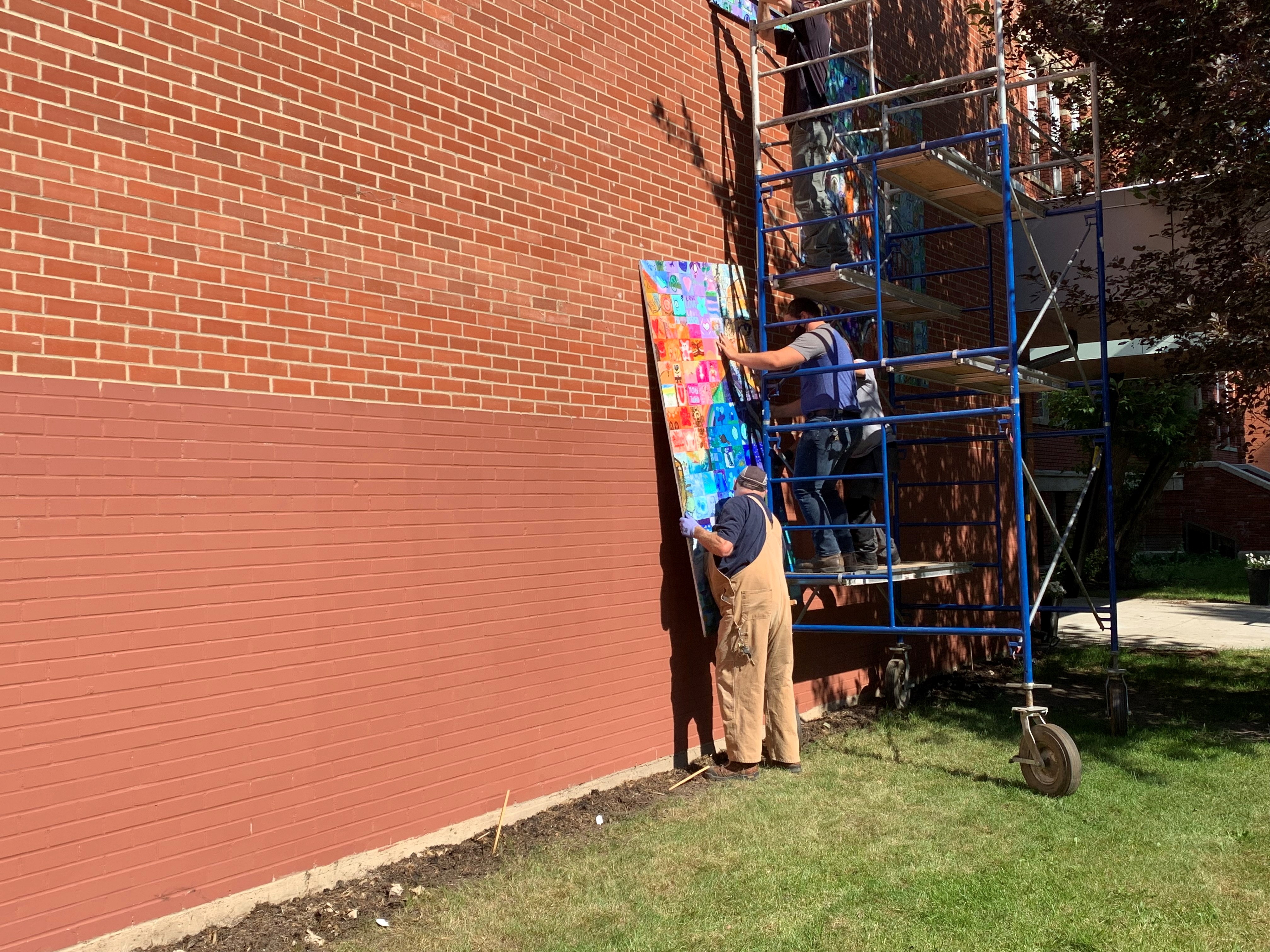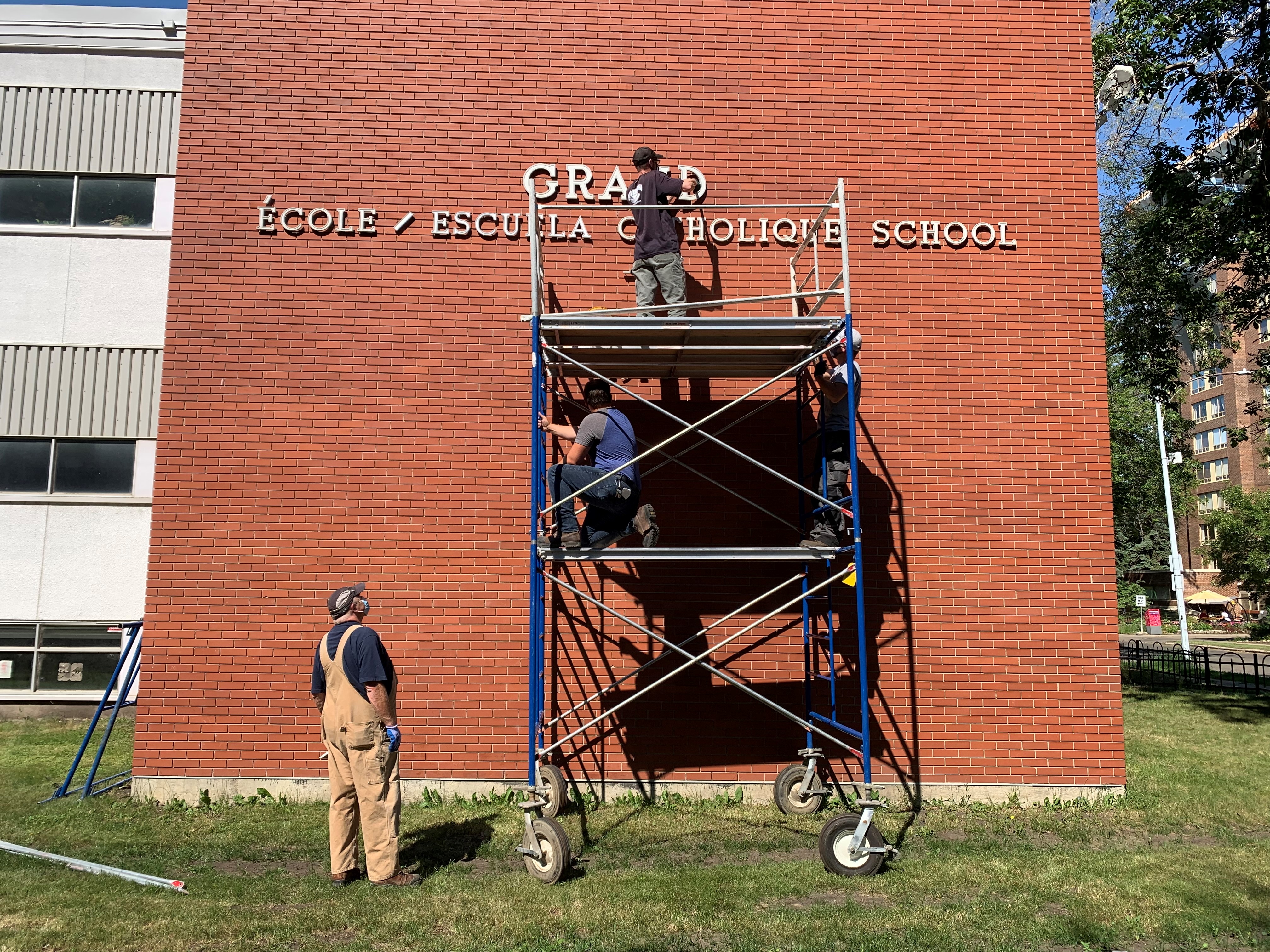 Immediately following a special meeting of school board trustees, work began to remove the name Grandin and the mural depicting Bishop Grandin from the exterior of the school located in central Edmonton.