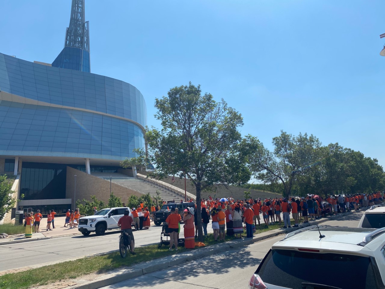 The No Pride in Genocide walk started at noon at the Canadian Museum for Human Rights, while the Every Child Matters event started at 1:00 p.m. at Portage and Main.