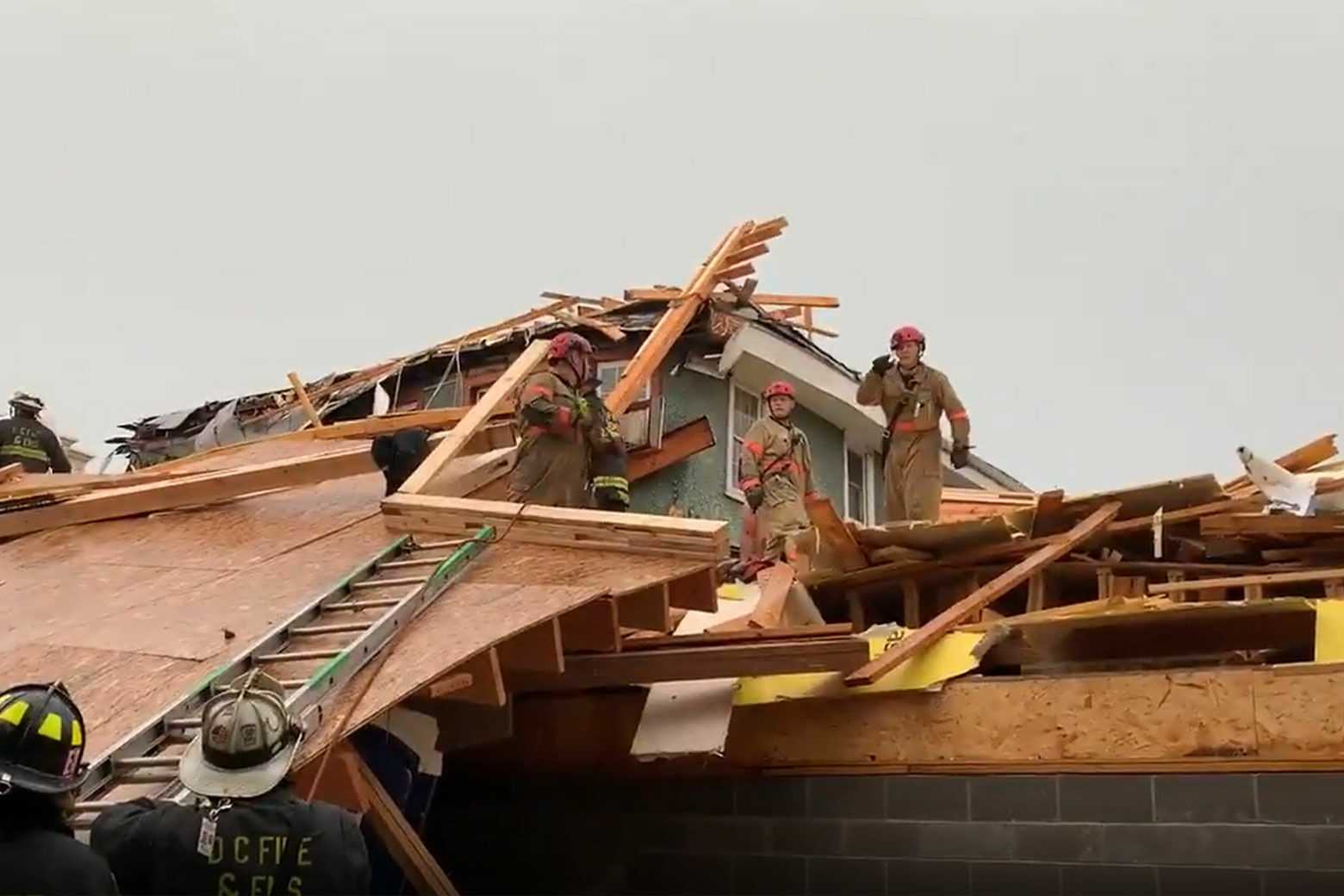 Images showed dozens of firefighters swarming over piles of wood left behind by the collapse, using saws and heavy equipment to move large pieces.