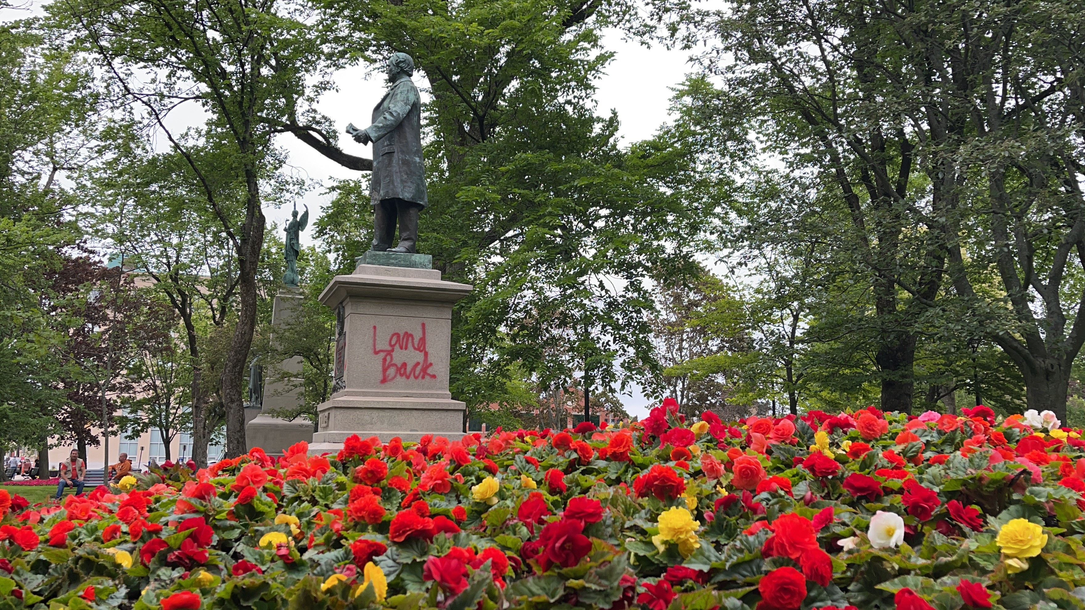 The plaque has been crossed out, red handprints adorn the base and the words “Land Back” are painted across one side.