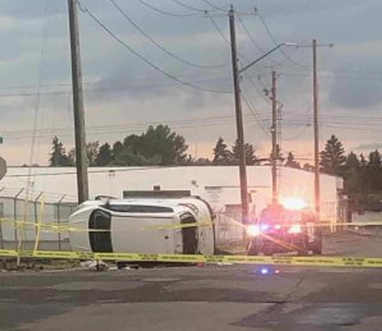 At the scene, a white vehicle had rolled onto its side with broken windows and was covered with police tape.