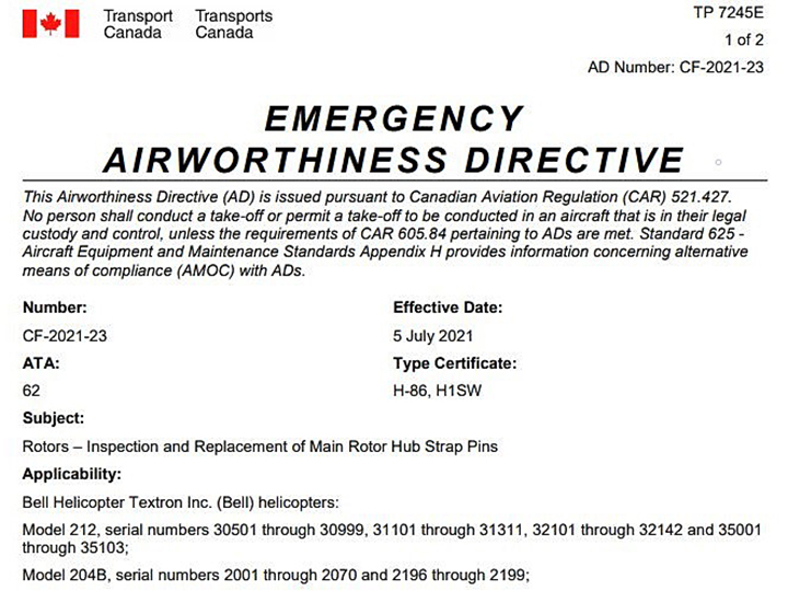 “To address the risk of detachment of main rotor hub strap pins in flight, this (airworthiness directive) is issued as an interim measure to mandate replacement of affected strap pins,” said Transport Canada.