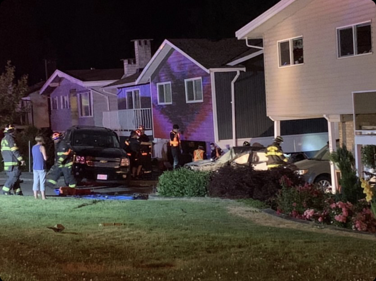 According to police, a blue Saturn and a black Ford both lost control; the Saturn hit a parked vehicle and then careened into a residential property.