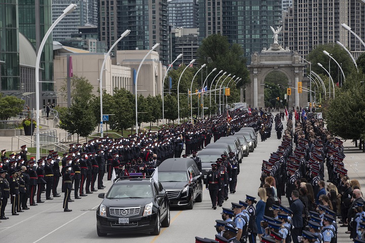 The two-hour funeral service followed a procession along Lake Shore Boulevard West and into the Exhibition Place grounds. Officers lined Princes’ Boulevard as the procession approached BMO Field, accompanied by a marching band and mounted unit officers.