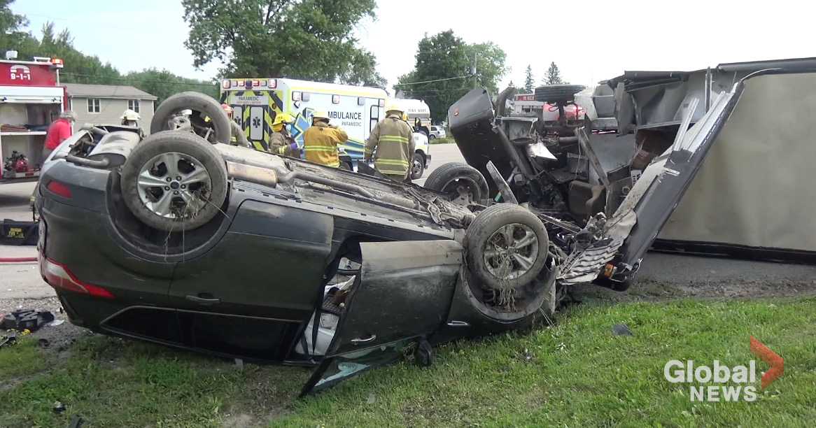 Peterborough County OPP on scene told Global News Peterborough it appears the SUV was travelling westbound on the highway when it left the roadway and struck a truck that was exiting a business lot to get onto the highway on the opposite side of the road.
