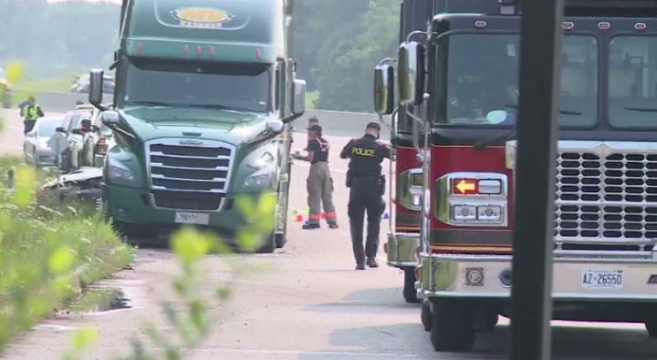 OPP said the vehicle was exiting the highway at the ramp into the westbound ONroute service centre when it collided with the back of the stopped truck pulled over on the right side.