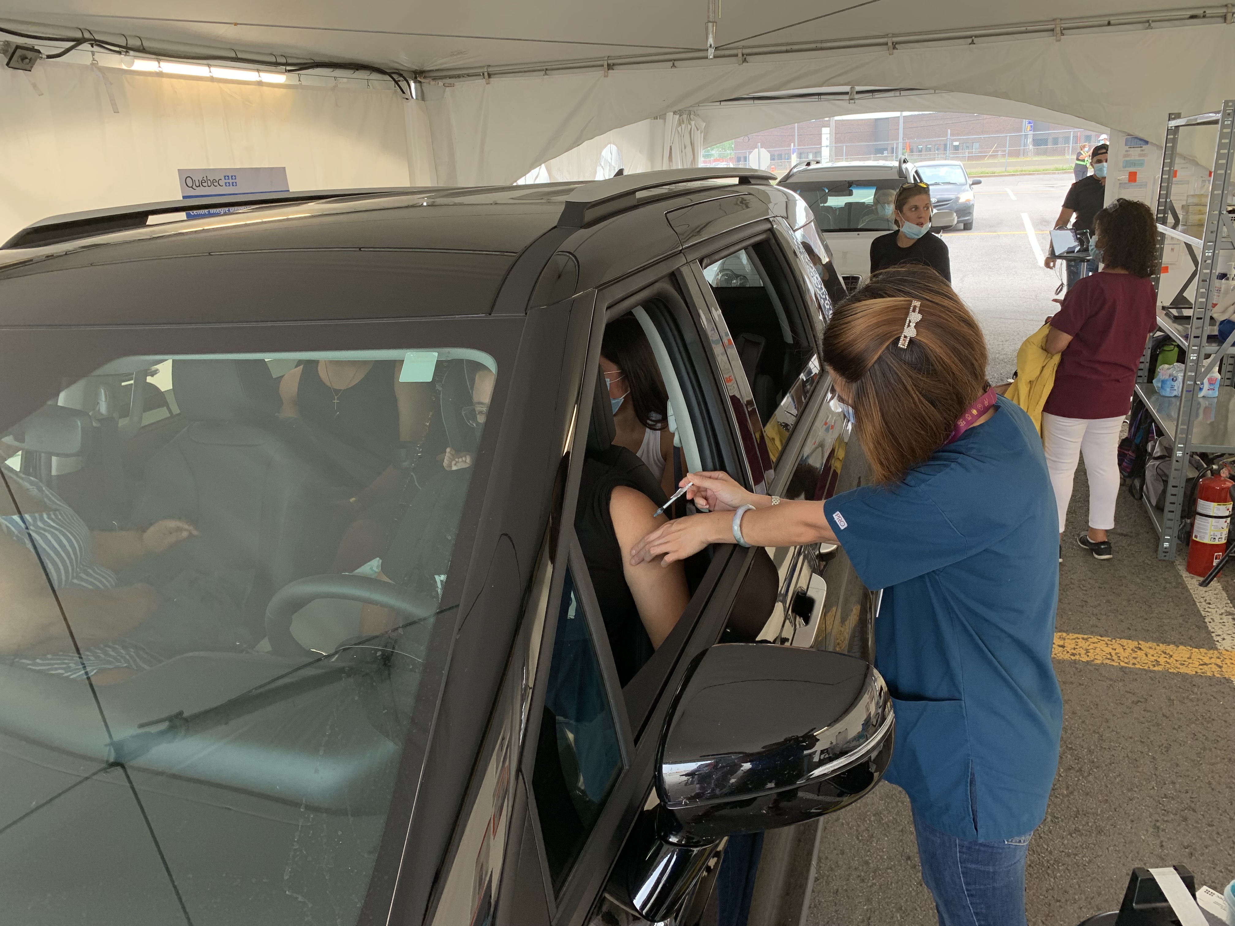 Health-care workers at the drive thru clinic at Trudeau airport are administering more than 800 shots a day and say they have the capacity to provide more shots.