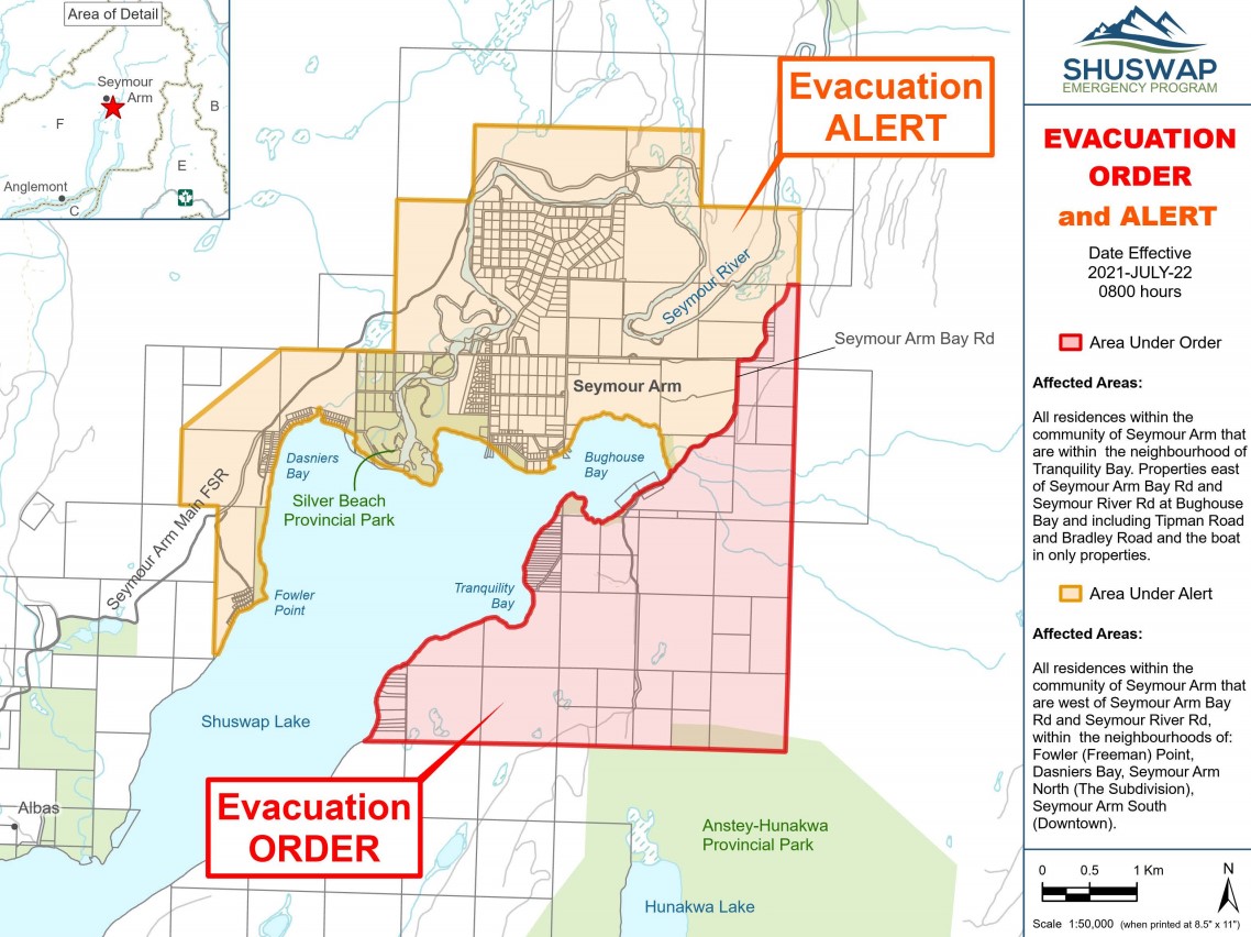 The regional district said the order affects approximately 39 people on the east side of Seymour Arm, and that firefighters went door-to-door to ensure people were notified.