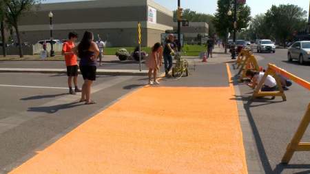 Youth from the non-profit Chokecherry Studios painted a few crosswalks orange along Broadway Avenue.