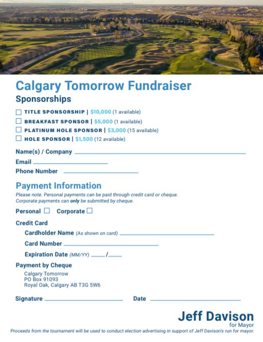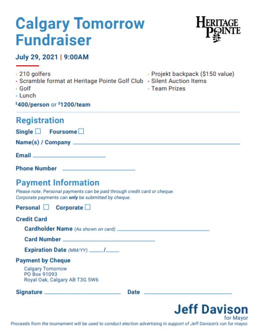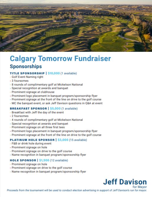 In a follow up email from Brownlee to supporters on July 20, the registration form advertised the event as the Calgary Tomorrow fundraiser and said “proceeds from the tournament will be used to conduct election advertising in support of Jeff Davison’s run for mayor.”