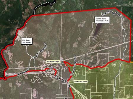 The RDKB says the evacuation order area includes Mt. Baldy Ski Resort extending east to include the west side of Fish Lake West Road, Belchrome Forest Service Road and Conkle Lake Provincial Park.