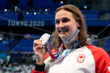 The LaSalle, Ont., native posted a time of 57.72 seconds in the event final Tuesday, just a fraction of a second behind Australian Kaylee McKeown, who took the gold. Regan Smith of the United States took the bronze.