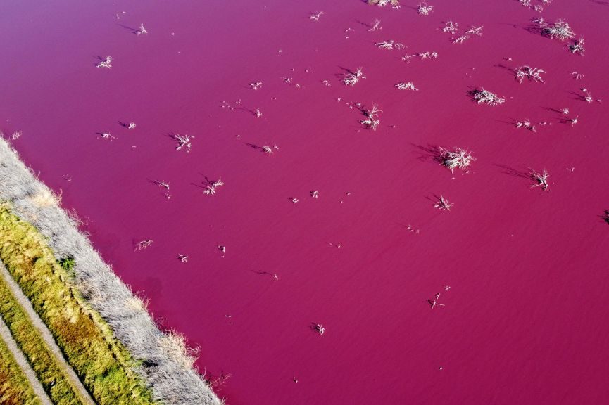 The water at the lagoon is typically blue, but activists say it took on a bright pink hue last week after local authorities reportedly permitted fish-processing plants to dump their waste in the nearby Chubut river, which feeds the lagoon.