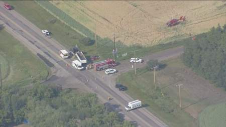 The Global 1 news helicopter spotted the collision, where a STARS Air Ambulance helicopter was seen in a field after it landed there to help. Other emergency vehicles were also at the scene.