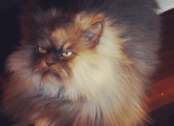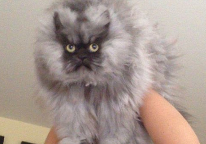 Owners Anne Marie Avey and Eric Rosario, of Los Angeles, say the 2-year-old cat got its name because of his epic frown and fur. It takes both of them to brush the cat’s fur three times a week.