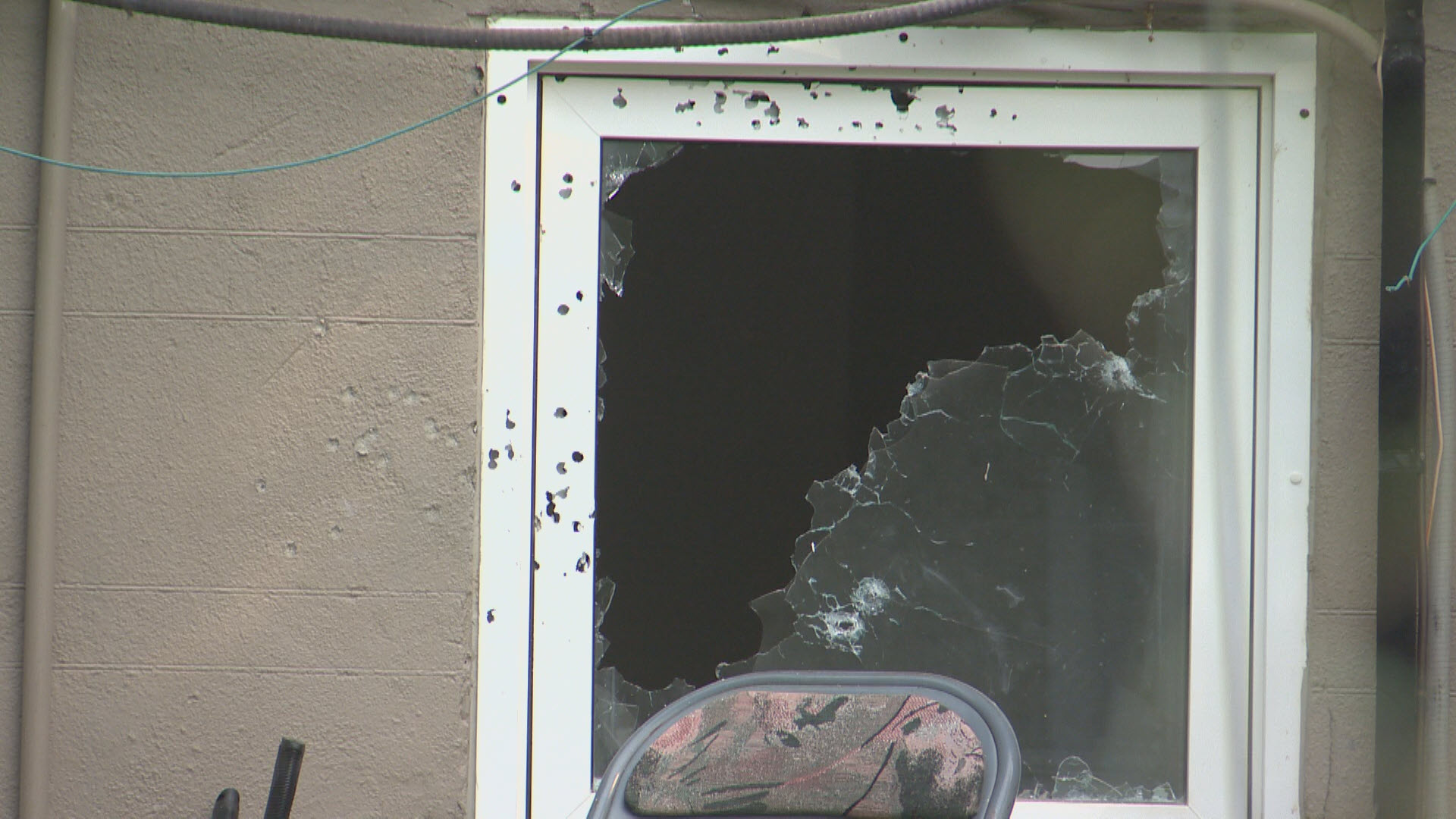 Police said the shots were fired at a home. Damage can be seen on the outside of the house, including a broken window, stripped siding and multiple holes.