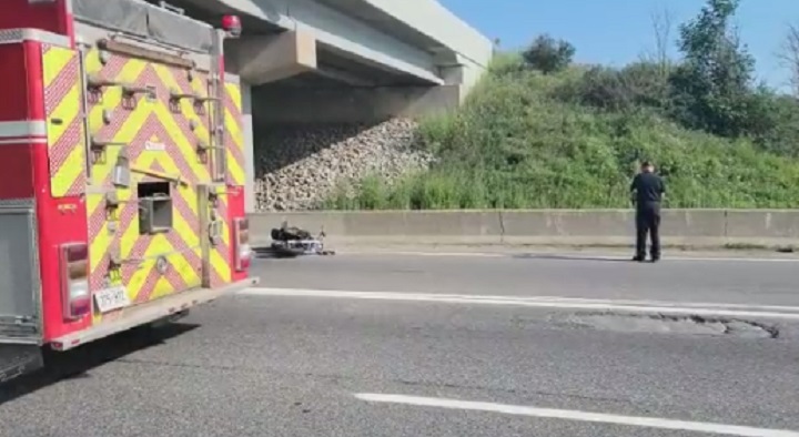 An OPP spokesperson said emergency crews were called to eastbound lanes of Highway 401 just after 3 p.m. when officers say the motorcyclist, who was travelling southbound on Highway 6, lost control and hit the side of the truck when trying to merge onto Highway 401.
