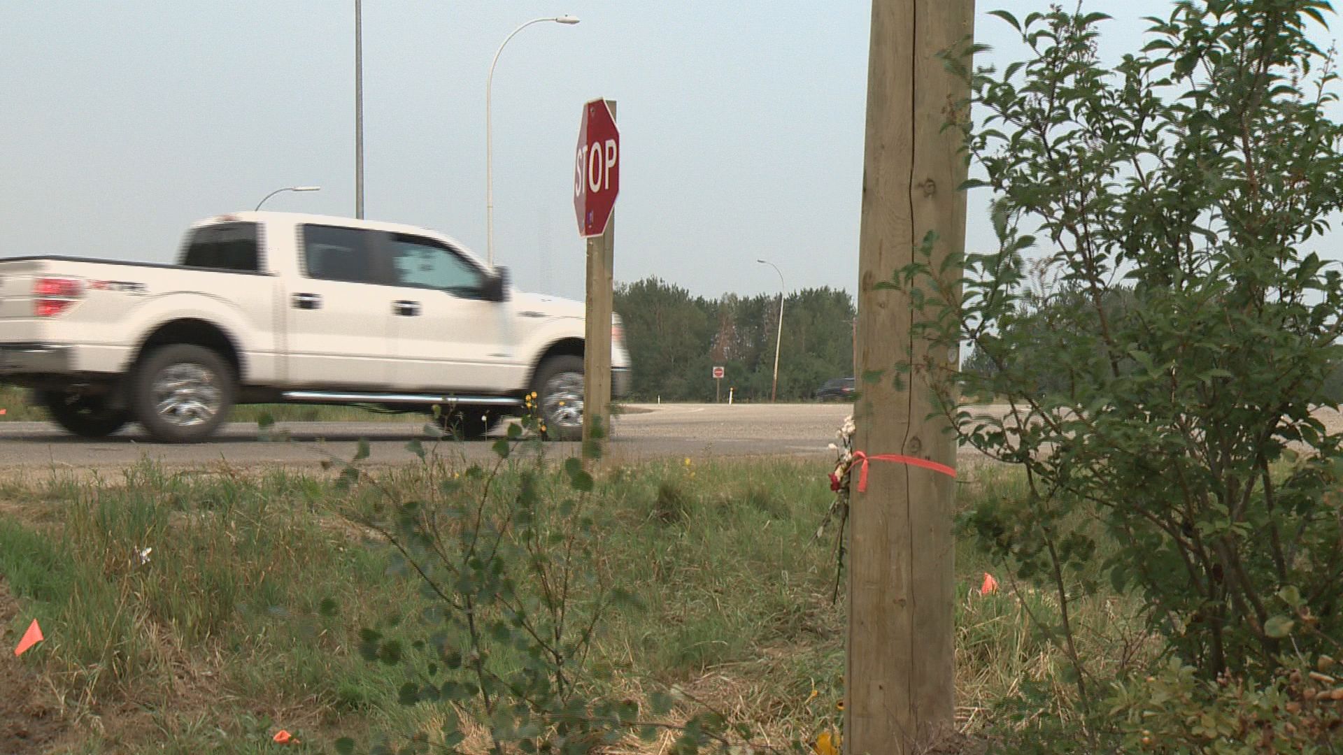 At the intersection of Highway 16A and Range Road 20 there are fresh flowers tied around a power pole, honouring a life lost on Aug. 2nd.
