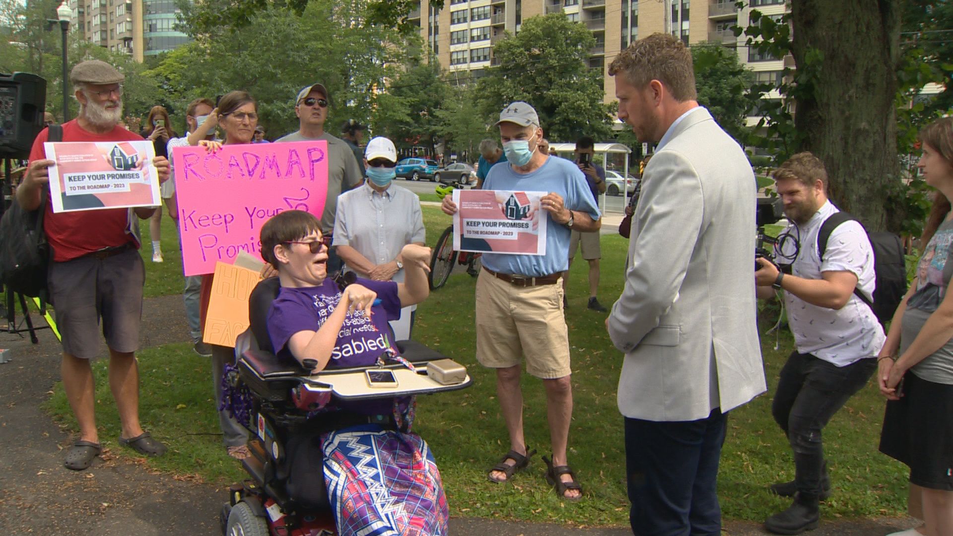 Rankin was flanked by more than a dozen protestors and accessibility advocates from the Community Home Action Group and the Disability Rights Coalition of Nova Scotia.
