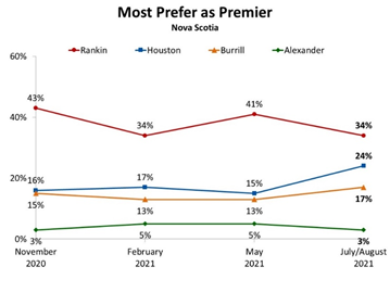 Thirty-four per cent of respondents said they would prefer Rankin as premier, down from 41 per cent in May. Meanwhile, 24 per cent said they would like to see Progressive Conservative leader Tim Houston in the premier’s seat, a big jump from the 15 per cent in May.
