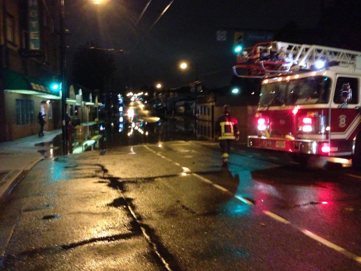 In Vancouver, some major streets resembled streams as heavy rain overwhelmed storm drains. Many pedestrians were also caught off-guard with water up their shins in some parts.