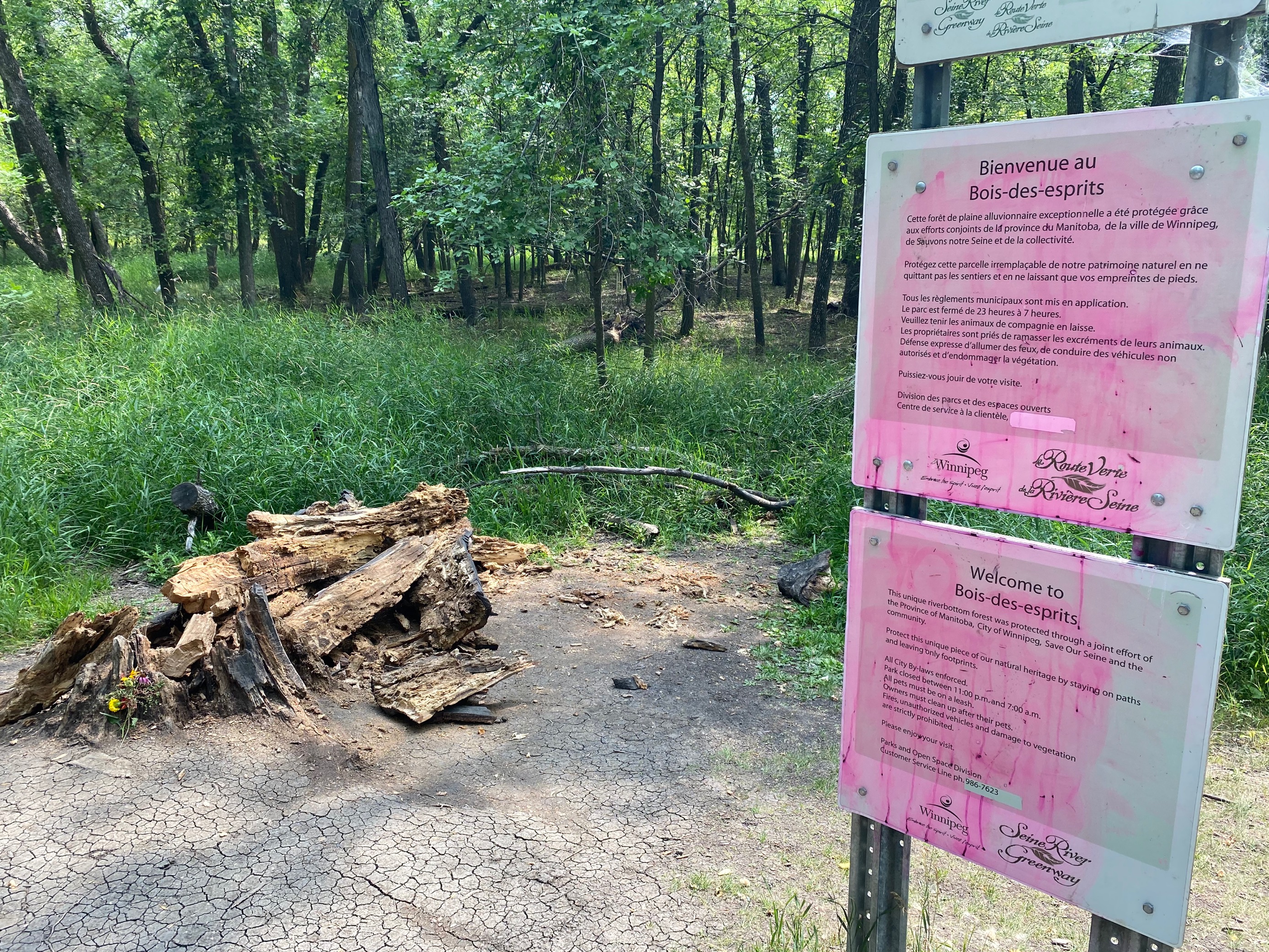 After greeting travelers in St. Vital’s Bois-des-Esprit for the last 17 years, a well-known forest guide has toppled over.