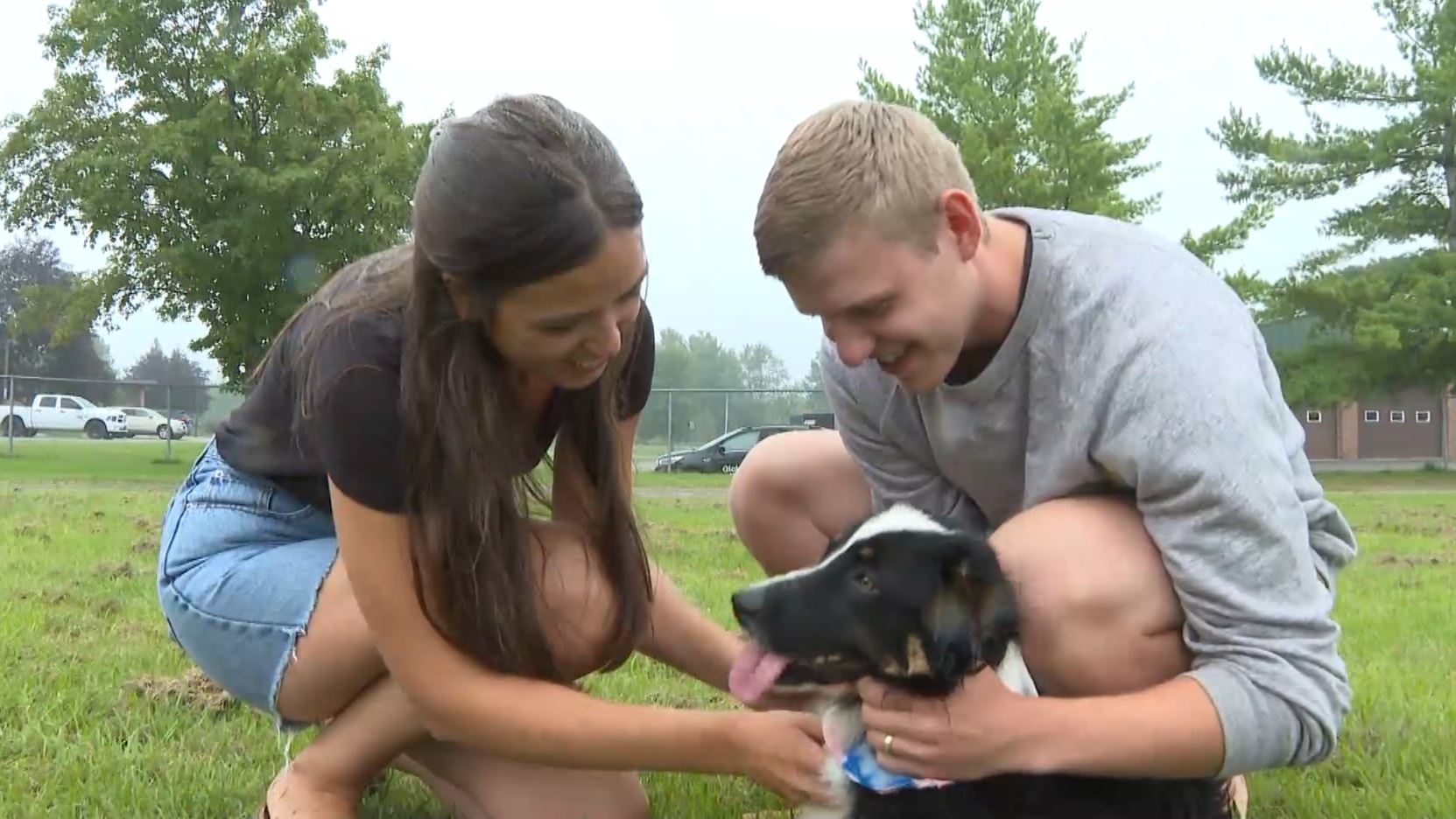 Playing fetch once again with little Opal is an amazing feeling for Gavin Bergsma and Claudia Woodruff.