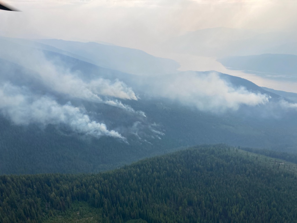 Smoke rises from the Octopus Creek wildfire along Lower Arrow Lake on Aug. 15. BC Wildfire Service