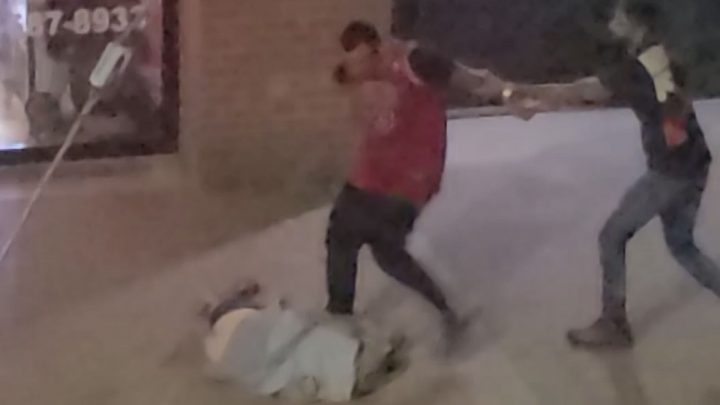 The suspect then chases the man down the street, pushes him to the ground, and kicks the defenceless victim multiple times.