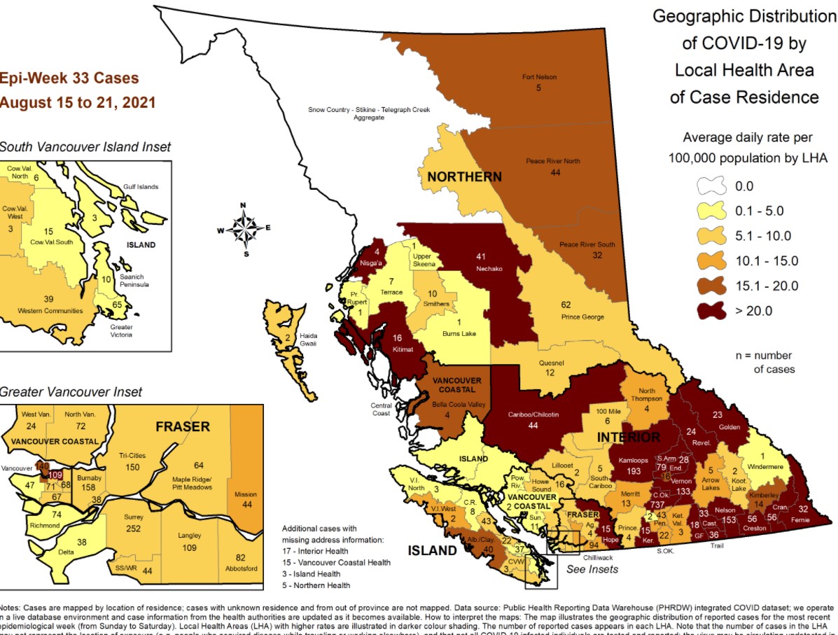 The Central Okanagan had 737 new cases from Aug. 15 to 21, for an average of 105 new cases a day. That’s a 20 per cent drop from the week earlier, when it had 922 cases.