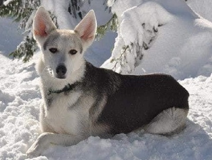 Kali is described as a medium, sized, slim black and white Husky cross with pointy ears.