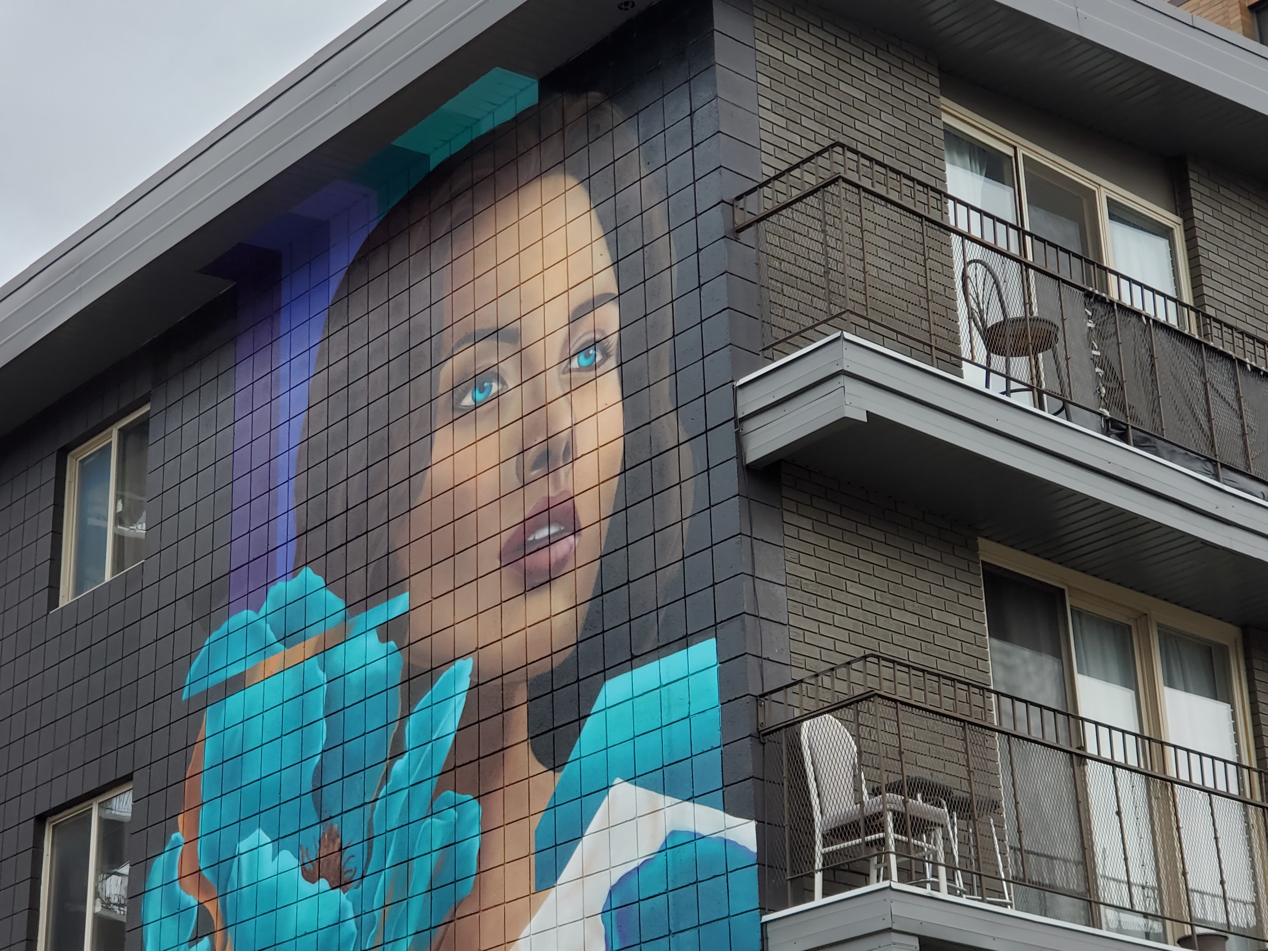 Her stunning blue eyes light up the side of a Calgary apartment building.