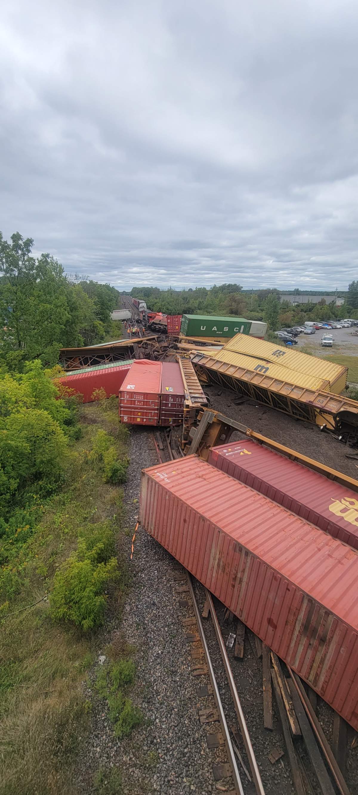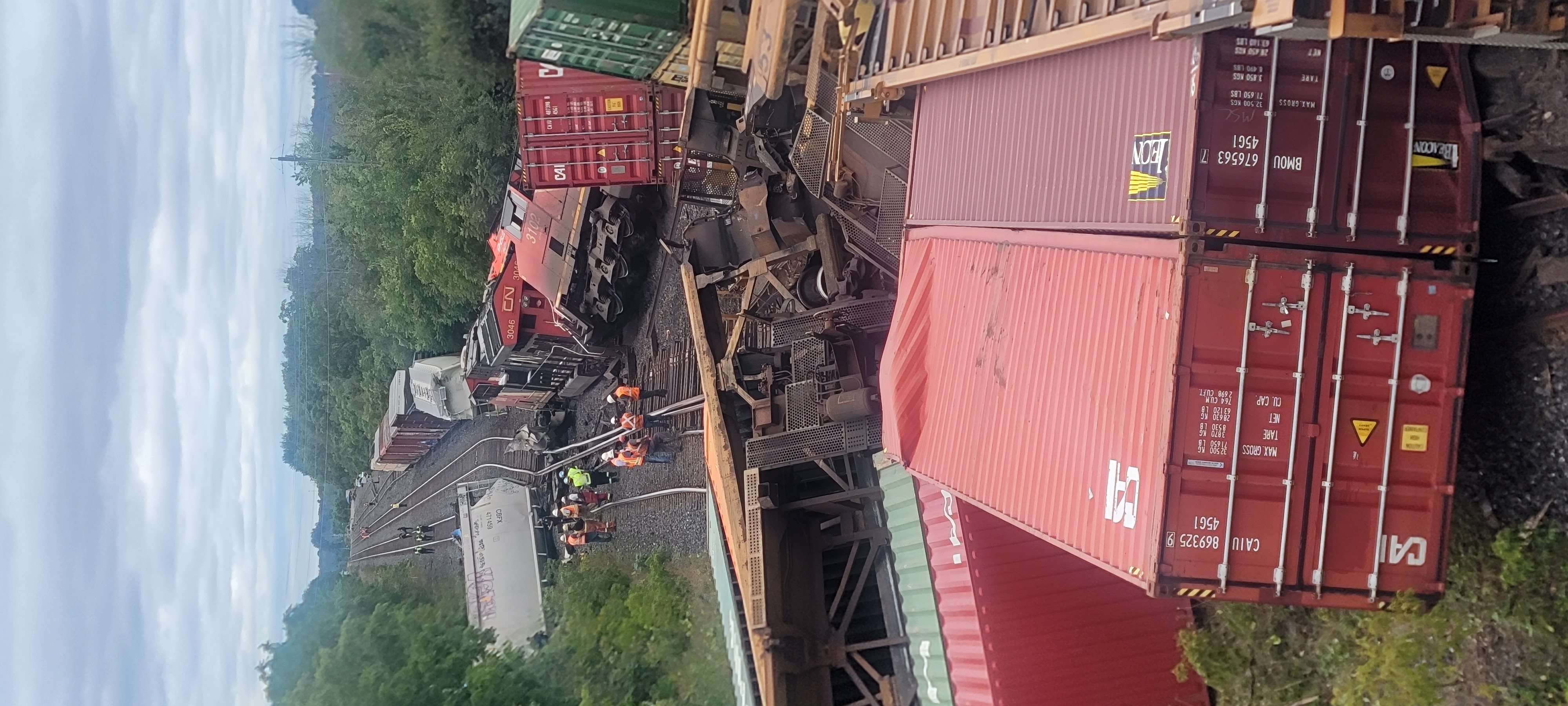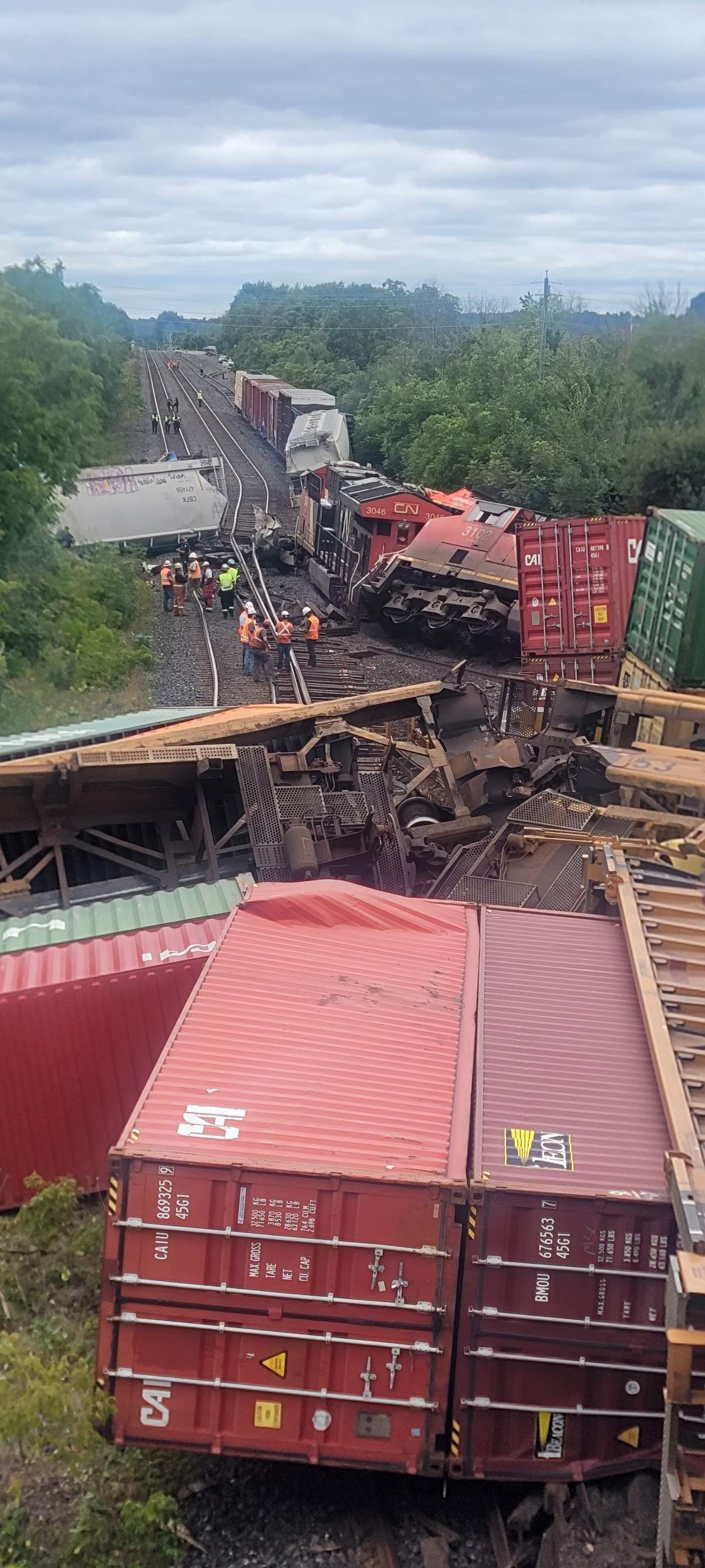 CN says in total, four locomotives have derailed, two of which are on their side, with approximately 16 cars off the tracks in various positions. One of the locomotives is reported to have a minor fuel leak, which CN says is being addressed.