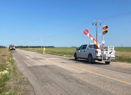 The “Guardian Angel” was developed by Watrous-based Guardian Angel Auto Flagger Manufacturing to allow flag people to be off roadways while controlling traffic.