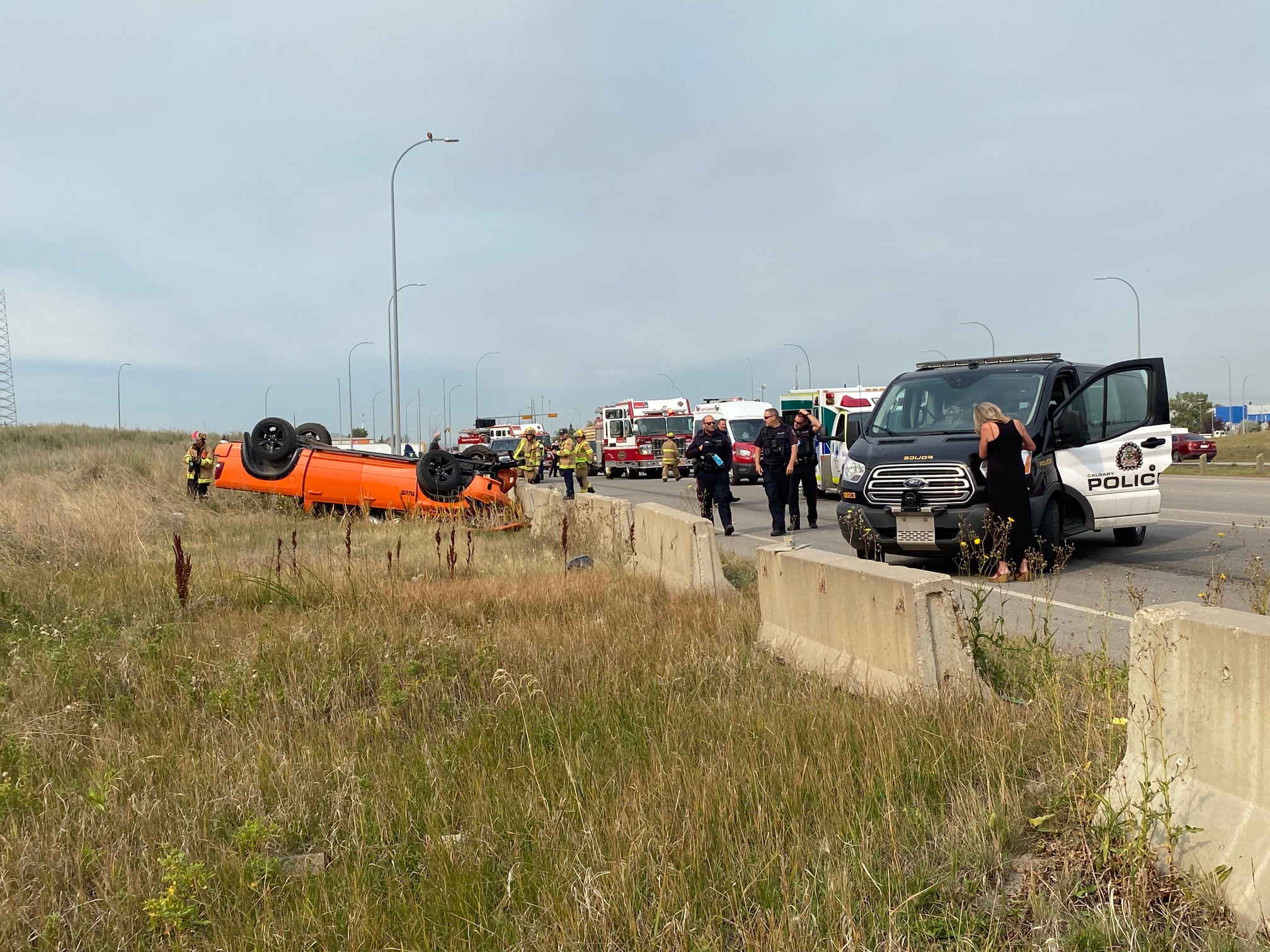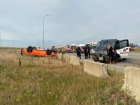Minutes later, police were notified about an orange truck that hit a building in the 5300 block of 94 Avenue S.E. and learned shortly after that one had rolled onto its roof at Glenmore Trail and 52 Street S.E.