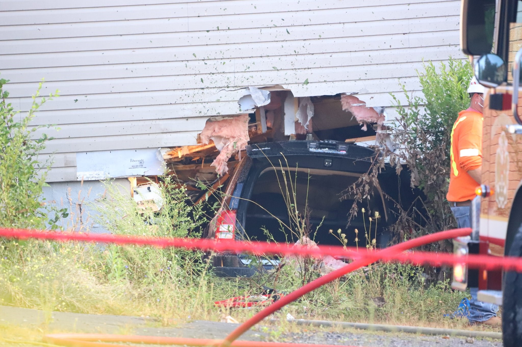 The Jeep broke through the wall of the home and came to rest in the basement.